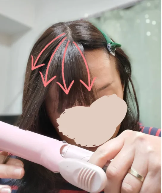 前髪をふんわりさせたい場合は、おでこから90度くらい角度をつけて(おでこから離して)、根本からアイロンを入れていきます。